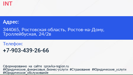 INT по адресу 344065, Ростовская область, Ростов-на-Дону, Троллейбусная, 24/2в в дальнейшем Организация, размещена в следующих категориях: