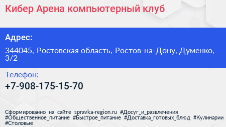 Кибер Арена, компьютерный клуб по адресу 344045, Ростовская область, Ростов-на-Дону, Думенко, 3/2 в дальнейшем Организация, размещена в следующих категориях: