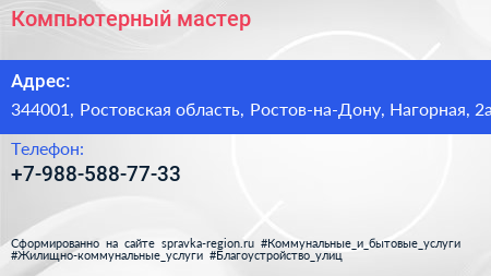 Компьютерный мастер по адресу 344001, Ростовская область, Ростов-на-Дону, Нагорная, 2а в дальнейшем Организация, размещена в следующих категориях: