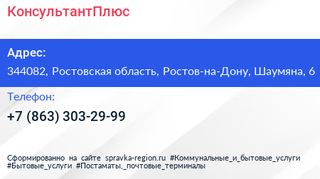 КонсультантПлюс по адресу 344082, Ростовская область, Ростов-на-Дону, Шаумяна, 6 в дальнейшем Организация, размещена в следующих категориях: