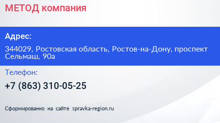 МЕТОД, компания по адресу 344029, Ростовская область, Ростов-на-Дону, проспект Сельмаш, 90а в дальнейшем Организация, размещена в следующих категориях: