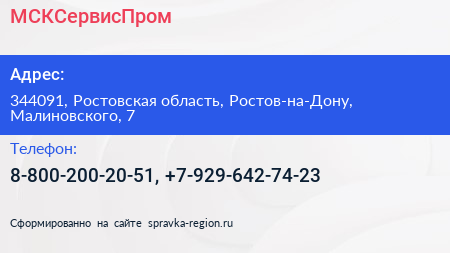 МСКСервисПром по адресу 344091, Ростовская область, Ростов-на-Дону, Малиновского, 7 в дальнейшем Организация, размещена в следующих категориях: