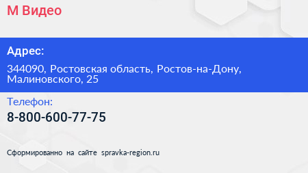 М.Видео по адресу 344090, Ростовская область, Ростов-на-Дону, Малиновского, 25 в дальнейшем Организация, размещена в следующих категориях:
