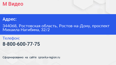 М.Видео по адресу 344068, Ростовская область, Ростов-на-Дону, проспект Михаила Нагибина, 32/2 в дальнейшем Организация, размещена в следующих категориях: