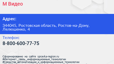 М.Видео по адресу 344045, Ростовская область, Ростов-на-Дону, Лелюшенко, 4 в дальнейшем Организация, размещена в следующих категориях: