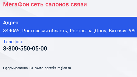 МегаФон, сеть салонов связи по адресу 344065, Ростовская область, Ростов-на-Дону, Вятская, 98г в дальнейшем Организация, размещена в следующих категориях: