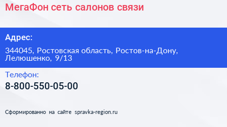 МегаФон, сеть салонов связи по адресу 344045, Ростовская область, Ростов-на-Дону, Лелюшенко, 9/13 в дальнейшем Организация, размещена в следующих категориях: