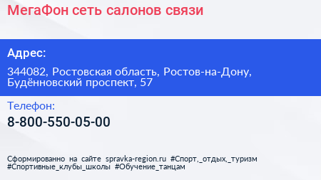 МегаФон, сеть салонов связи по адресу 344082, Ростовская область, Ростов-на-Дону, Будённовский проспект, 57 в дальнейшем Организация, размещена в следующих категориях: