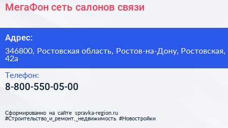 МегаФон, сеть салонов связи по адресу 346800, Ростовская область, Ростов-на-Дону, Ростовская, 42а в дальнейшем Организация, размещена в следующих категориях:
