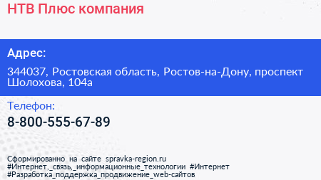 НТВ-Плюс, компания по адресу 344037, Ростовская область, Ростов-на-Дону, проспект Шолохова, 104а в дальнейшем Организация, размещена в следующих категориях: