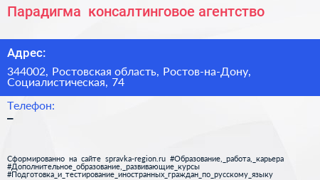 Парадигма+, консалтинговое агентство по адресу 344002, Ростовская область, Ростов-на-Дону, Социалистическая, 74 в дальнейшем Организация, размещена в следующих категориях: