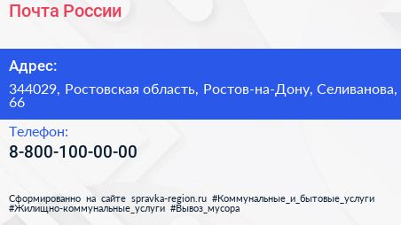 Почта России по адресу 344029, Ростовская область, Ростов-на-Дону, Селиванова, 66 в дальнейшем Организация, размещена в следующих категориях: