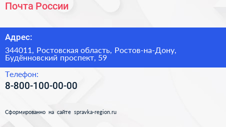 Почта России по адресу 344011, Ростовская область, Ростов-на-Дону, Будённовский проспект, 59 в дальнейшем Организация, размещена в следующих категориях: