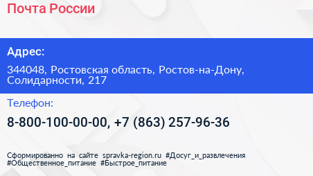 Почта России по адресу 344048, Ростовская область, Ростов-на-Дону, Солидарности, 217 в дальнейшем Организация, размещена в следующих категориях: