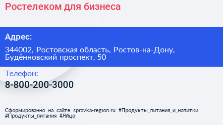 Ростелеком для бизнеса по адресу 344002, Ростовская область, Ростов-на-Дону, Будённовский проспект, 50 в дальнейшем Организация, размещена в следующих категориях: