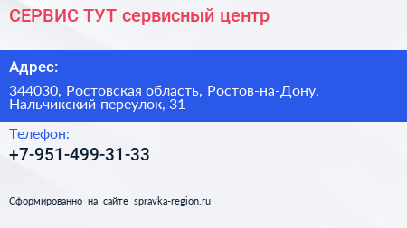 СЕРВИС-ТУТ, сервисный центр по адресу 344030, Ростовская область, Ростов-на-Дону, Нальчикский переулок, 31 в дальнейшем Организация, размещена в следующих категориях: