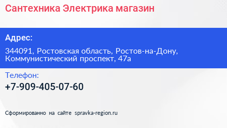 Сантехника & Электрика, магазин по адресу 344091, Ростовская область, Ростов-на-Дону, Коммунистический проспект, 47а в дальнейшем Организация, размещена в следующих категориях: