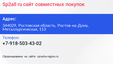 Sp2all.ru, сайт совместных покупок по адресу 344029, Ростовская область, Ростов-на-Дону, Металлургическая, 113 в дальнейшем Организация, размещена в следующих категориях: