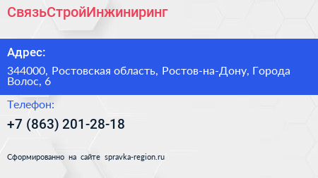 СвязьСтройИнжиниринг по адресу 344000, Ростовская область, Ростов-на-Дону, Города Волос, 6 в дальнейшем Организация, размещена в следующих категориях: