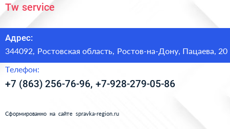 Tw service по адресу 344092, Ростовская область, Ростов-на-Дону, Пацаева, 20 в дальнейшем Организация, размещена в следующих категориях: