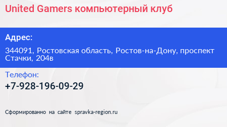 United Gamers, компьютерный клуб по адресу 344091, Ростовская область, Ростов-на-Дону, проспект Стачки, 204в в дальнейшем Организация, размещена в следующих категориях:
