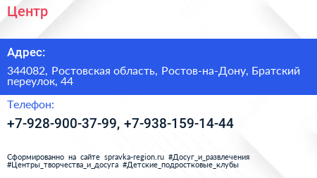 Центр по адресу 344082, Ростовская область, Ростов-на-Дону, Братский переулок, 44 в дальнейшем Организация, размещена в следующих категориях: