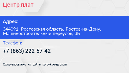 Центр плат по адресу 344091, Ростовская область, Ростов-на-Дону, Машиностроительный переулок, 3Б в дальнейшем Организация, размещена в следующих категориях: