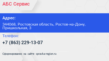 АБС-Сервис по адресу 344068, Ростовская область, Ростов-на-Дону, Пришкольная, 3 в дальнейшем Организация, размещена в следующих категориях: