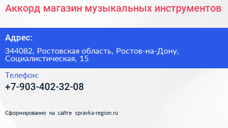 Аккорд, магазин музыкальных инструментов по адресу 344082, Ростовская область, Ростов-на-Дону, Социалистическая, 15 в дальнейшем Организация, размещена в следующих категориях: