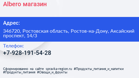 Albero, магазин по адресу 346720, Ростовская область, Ростов-на-Дону, Аксайский проспект, 14/3 в дальнейшем Организация, размещена в следующих категориях: