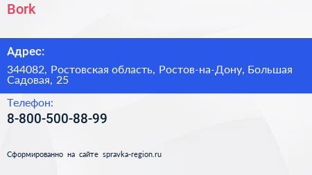 Bork по адресу 344082, Ростовская область, Ростов-на-Дону, Большая Садовая, 25 в дальнейшем Организация, размещена в следующих категориях: