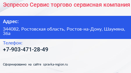 Эспрессо-Сервис, торгово-сервисная компания по адресу 344082, Ростовская область, Ростов-на-Дону, Шаумяна, 36а в дальнейшем Организация, размещена в следующих категориях: