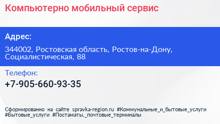 Компьютерно-мобильный сервис по адресу 344002, Ростовская область, Ростов-на-Дону, Социалистическая, 88 в дальнейшем Организация, размещена в следующих категориях: