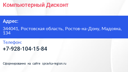 Компьютерный Дисконт по адресу 344041, Ростовская область, Ростов-на-Дону, Мадояна, 134 в дальнейшем Организация, размещена в следующих категориях: