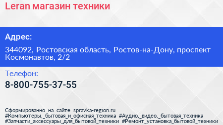 Leran, магазин техники по адресу 344092, Ростовская область, Ростов-на-Дону, проспект Космонавтов, 2/2 в дальнейшем Организация, размещена в следующих категориях: