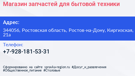 Магазин запчастей для бытовой техники по адресу 344056, Ростовская область, Ростов-на-Дону, Киргизская, 21а в дальнейшем Организация, размещена в следующих категориях:
