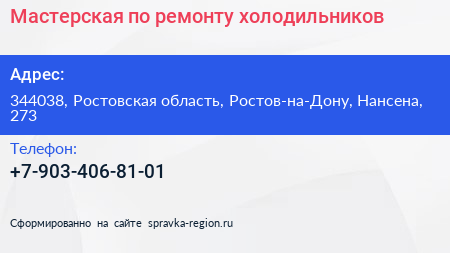 Мастерская по ремонту холодильников по адресу 344038, Ростовская область, Ростов-на-Дону, Нансена, 273 в дальнейшем Организация, размещена в следующих категориях: