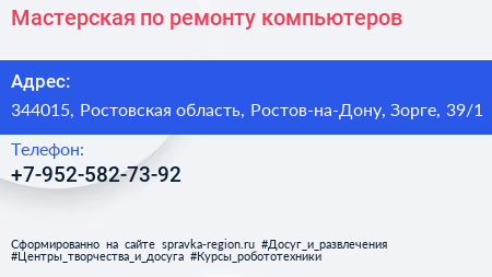 Мастерская по ремонту компьютеров по адресу 344015, Ростовская область, Ростов-на-Дону, Зорге, 39/1 в дальнейшем Организация, размещена в следующих категориях: