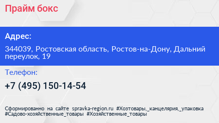 Прайм бокс по адресу 344039, Ростовская область, Ростов-на-Дону, Дальний переулок, 19 в дальнейшем Организация, размещена в следующих категориях: