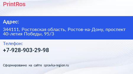 PrintRos по адресу 344111, Ростовская область, Ростов-на-Дону, проспект 40-летия Победы, 95/3 в дальнейшем Организация, размещена в следующих категориях: