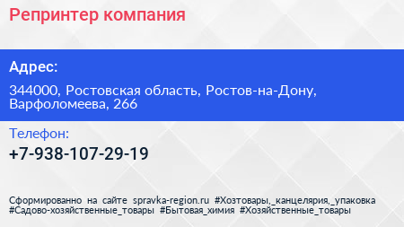 Репринтер, компания по адресу 344000, Ростовская область, Ростов-на-Дону, Варфоломеева, 266 в дальнейшем Организация, размещена в следующих категориях: