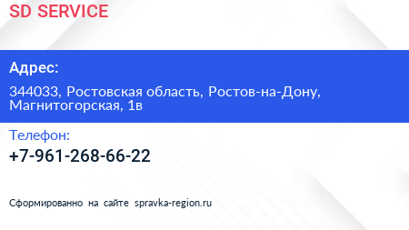 SD-SERVICE по адресу 344033, Ростовская область, Ростов-на-Дону, Магнитогорская, 1в в дальнейшем Организация, размещена в следующих категориях: