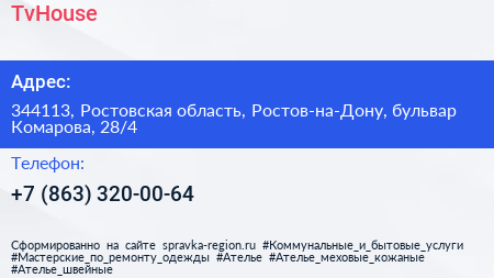 TvHouse по адресу 344113, Ростовская область, Ростов-на-Дону, бульвар Комарова, 28/4 в дальнейшем Организация, размещена в следующих категориях: