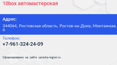 10box, автомастерская по адресу 344064, Ростовская область, Ростов-на-Дону, Монтажная, 6 в дальнейшем Организация, размещена в следующих категориях: