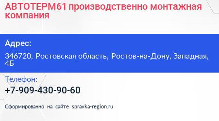 АВТОТЕРМ61, производственно-монтажная компания по адресу 346720, Ростовская область, Ростов-на-Дону, Западная, 4Б в дальнейшем Организация, размещена в следующих категориях: