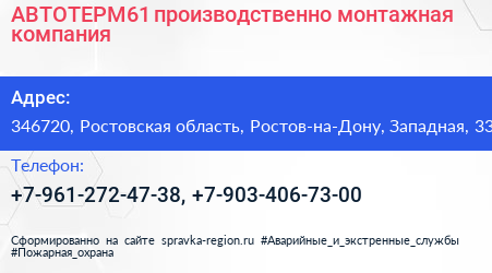 АВТОТЕРМ61, производственно-монтажная компания по адресу 346720, Ростовская область, Ростов-на-Дону, Западная, 33 в дальнейшем Организация, размещена в следующих категориях: