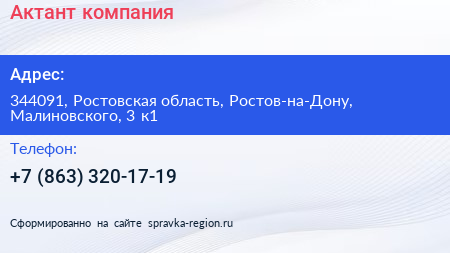 Для связи с организацией воспользуйтесь номером телефона: +7 (863) 320-17-19. Пн: c 09:00-18:00, Вт: c 09:00-18:00, Ср: c 09:00-18:00, Чт: c 09:00-18:00, Пт: c 09:00-18:00, Сб: выходной, Вс: выходной, вы можете обратиться в эту организацию.