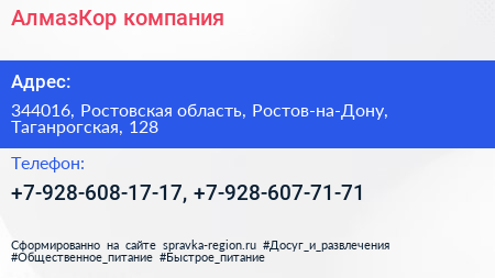 АлмазКор, компания по адресу 344016, Ростовская область, Ростов-на-Дону, Таганрогская, 128 в дальнейшем Организация, размещена в следующих категориях: