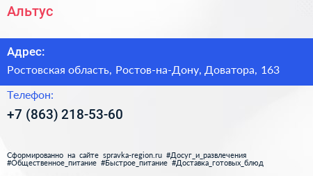 Альтус по адресу Ростовская область, Ростов-на-Дону, Доватора, 163 в дальнейшем Организация, размещена в следующих категориях: