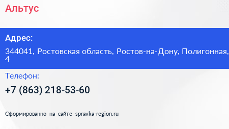 Альтус по адресу 344041, Ростовская область, Ростов-на-Дону, Полигонная, 4 в дальнейшем Организация, размещена в следующих категориях: